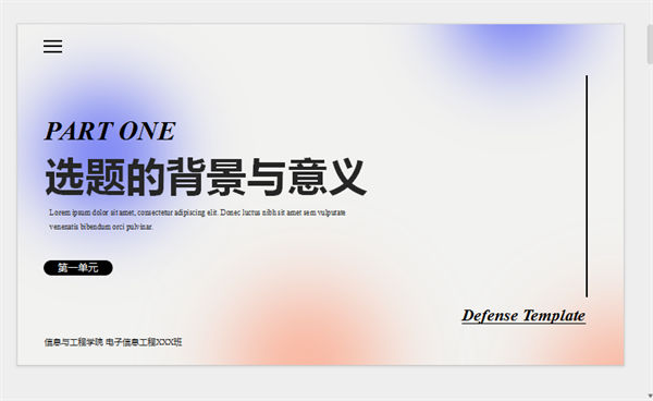 所属频道:毕业答辩PPT 更新时间:2025-07-16 素材版本:PowerPoint2007及以上版本(.pptx) 下载类型:付费下载 文件大小:2835 KB 显示比例:宽屏16:9 附件类型:.rar 声明:本站所有文章,如无特殊说明或标注,均来源于网络搜集整理。若侵犯了原著者的合法权益,可联系我们进行处理。本站原创发布的内容,任何个人或组织,未征得本站同意,禁止复制、盗用、采集、发布本站内容到任何网站、媒体等各类平台。