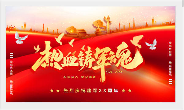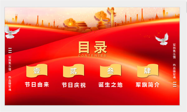 所属频道:建军节PPT模板 更新时间:2025-08-07 素材版本:PowerPoint2007及以上版本(.pptx) 下载类型:付费下载 文件大小:4.35 MB 显示比例:宽屏16:9 附件类型:.rar 目录:详细介绍下载地址相关下载发表评论 声明:本站所有文章,如无特殊说明或标注,均来源于网络搜集整理。若侵犯了原著者的合法权益,可联系我们进行处理。本站原创发布的内容,任何个人或组织,未征得本站同意,禁止复制、盗用、采集、发布本站内容到任何网站、媒体等各类平台。