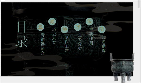 所属频道:其他行业PPT 更新时间:2025-10-06 素材版本:PowerPoint2007及以上版本(.pptx) 下载类型:付费下载 文件大小:6885 KB 显示比例:宽屏16:9 附件类型:.rar 目录:详细介绍下载地址相关下载发表评论 标签:青铜器黑色