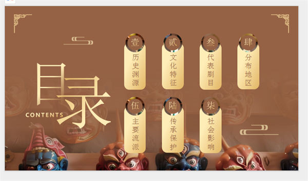 所属频道:其他行业PPT 更新时间:2025-10-11 素材版本:PowerPoint2007及以上版本(.pptx) 下载类型:付费下载 文件大小:2206 KB 显示比例:宽屏16:9 附件类型:.rar 目录:详细介绍下载地址相关下载发表评论 标签:褐色非物质文化遗产非遗