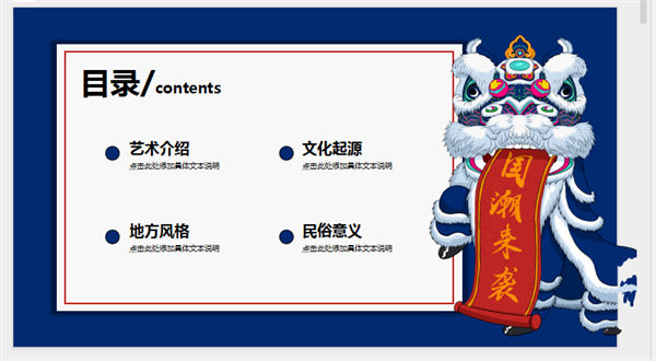 所属频道:其他行业PPT 更新时间:2025-10-21 素材版本:PowerPoint2007及以上版本(.pptx) 下载类型:付费下载 文件大小:12376 KB 显示比例:宽屏16:9 附件类型:.rar 目录:详细介绍下载地址相关下载发表评论 标签:蓝色舞狮传统文化国潮