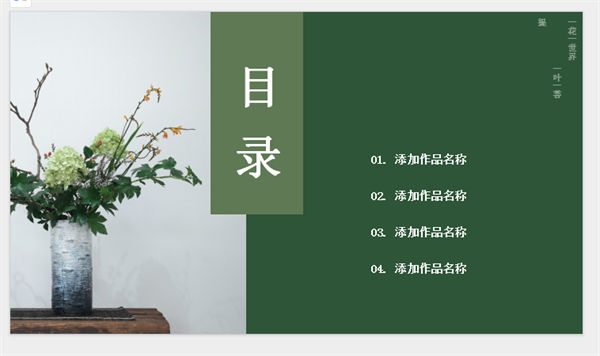 所属频道:其他行业PPT 更新时间:2025-10-22 素材版本:PowerPoint2007及以上版本(.pptx) 下载类型:付费下载 文件大小:5899 KB 显示比例:宽屏16:9 附件类型:.rar 目录:详细介绍下载地址相关下载发表评论 标签:绿色作品集插花