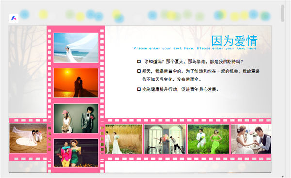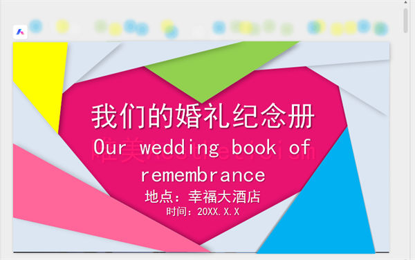所属频道:爱情PPT模板 更新时间:2023-05-11 素材版本:PowerPoint2007及以上版本(.pptx) 下载类型:付费下载 文件大小:6.74 MB 显示比例:宽屏16:9 附件类型:.rar 目录:详细介绍下载地址相关下载发表评论 标签:电子相册婚礼相册结婚婚礼婚庆