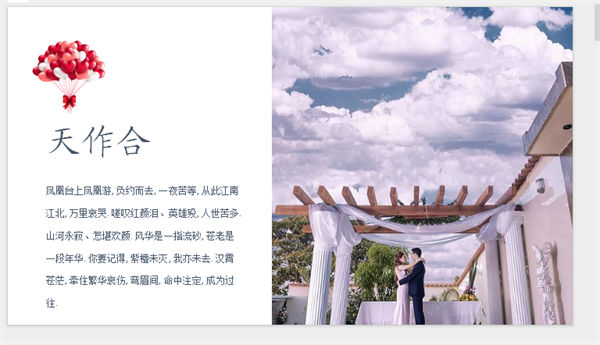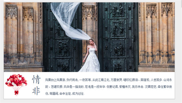 所属频道:爱情PPT模板 更新时间:2023-05-12 素材版本:PowerPoint2007及以上版本(.pptx) 下载类型:付费下载 文件大小:4.04 MB 显示比例:宽屏16:9 附件类型:.rar 目录:详细介绍下载地址相关下载发表评论 标签:电子相册婚礼相册结婚婚礼婚庆