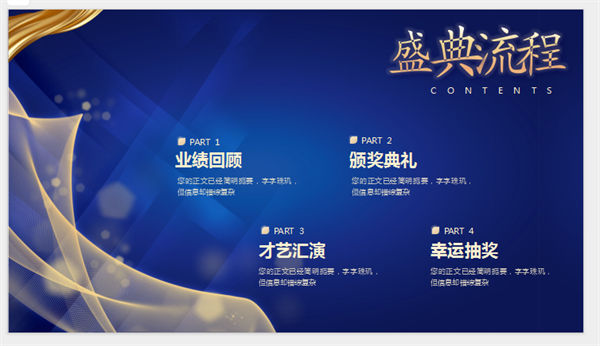所属频道:年会颁奖PPT模板 更新时间:2024-04-13 素材版本:PowerPoint2007及以上版本(.pptx) 下载类型:付费下载 文件大小:4865 KB 显示比例:宽屏16:9 附件类型:.rar 目录:详细介绍下载地址相关下载发表评论 标签:蓝色颁奖盛典表彰大会蓝金