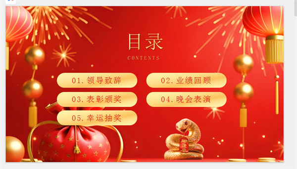 所属频道:年会颁奖PPT模板 更新时间:2025-02-19 素材版本:PowerPoint2007及以上版本(.pptx) 下载类型:付费下载 文件大小:9928 KB 显示比例:宽屏16:9 附件类型:.rar 目录:详细介绍下载地址相关下载发表评论 标签:红金喜庆蛇年表彰大会