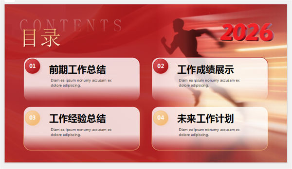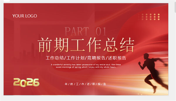 所属频道:述职报告PPT 更新时间:2025-11-25 素材版本:PowerPoint2007及以上版本(.pptx) 下载类型:付费下载 文件大小:4945 KB 显示比例:宽屏16:9 附件类型:.rar 目录:详细介绍下载地址相关下载发表评论 标签:红色奔跑人物剪影励志