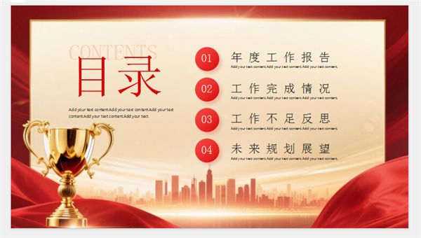 所属频道:述职报告PPT 更新时间:2025-11-25 素材版本:PowerPoint2007及以上版本(.pptx) 下载类型:付费下载 文件大小:853 KB 显示比例:宽屏16:9 附件类型:.rar 目录:详细介绍下载地址相关下载发表评论 标签:红色红金奖杯城市剪影