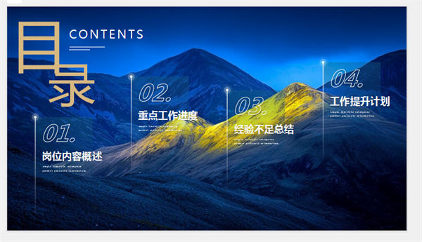 所属频道:述职报告PPT 更新时间:2025-12-08 素材版本:PowerPoint2007及以上版本(.pptx) 下载类型:付费下载 文件大小:716 KB 显示比例:宽屏16:9 附件类型:.rar 目录:详细介绍下载地址相关下载发表评论 标签:山峰高山蓝色 声明:本站所有文章,如无特殊说明或标注,均来源于网络搜集整理。若侵犯了原著者的合法权益,可联系我们进行处理。本站原创发布的内容,任何个人或组织,未征得本站同意,禁止复制、盗用、采集、发布本站内容到任何网站、媒体等各类平台。